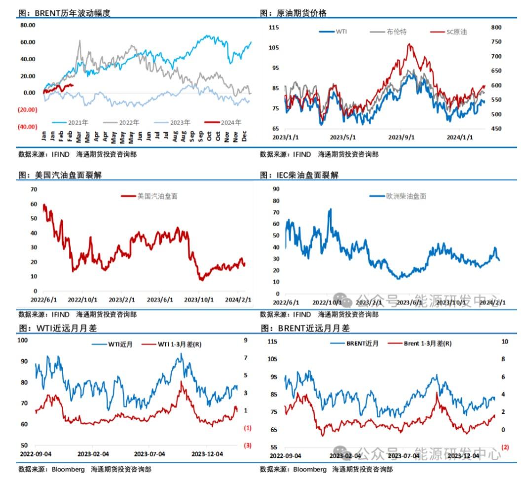从供应端来看,贝克休斯最新消息美国钻井公司增加六口石油钻井,为自去年11月以来最大周增幅。尽管如此美国原油产量在2024年增速将较23年明显减缓。美国、及南美巴西、圭亚那等国家将成为2024年原油市场主要增量者。欧佩克+减产执行背景下,供应端压力在一季度有所缓解,从目前核心欧佩克+成员国表态将遵守减产协议来看,石油输出国组织维持石油市场稳定的态度仍是非常坚决。目前让市场犹豫不定的是原油市场需求端,从三大权威机构二月份月报对需求判断来看,分歧较大,对全球经济增长预期的差异及对能源转型过程能源需求预期的不同的导致了不同预期。从目前中美二国的炼油开工来看,2月份需求端确实没有给油价带来支撑,反而是在过去一段时间成为拖累油价表现的因素,中国在过去一周因为糟糕的极寒天气延迟了国内需求的启动,积极的是预期随着糟糕天气结束后中国市场节后经济运行重新启动及美国炼厂逐渐结束检修炼油量回升。可以预见占全球需求份额超35%的中美需求的启动会改变之前的疲弱表现,这对油价接下来的表现将是一个非常关键的影响因素。