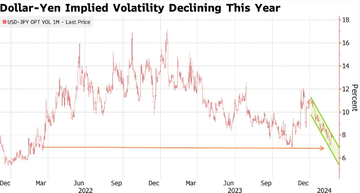 策略师表示,美元/日元的一个月隐含波动率可能会降至2022年3月以来的最低水平。加剧这一下跌的是该货币对每日交易区间的缩小,这是由于相互限制双向波动的力量造成的。