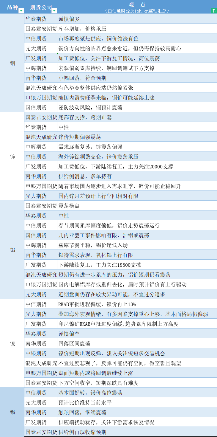 标题:期货公司观点汇总一张图:2月27日有色系(铜、锌、铝、镍、锡等)