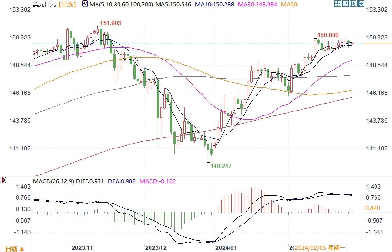 美元指数承压。后续美国还将公布更多的重要数据,如周四的核心个人消费支出(PCE)物价指数。投资者们希望从数据中获得更多美联储下一步动向的线索。因此,周二美日数据并未能促使美元形成大幅度下走局势。日线图上,美元/日元仍旧维持在150水平和布林带通道中轨线之上,走势呈窄幅区间波动状态。交易员对于是否继续推高美元显得有些谨慎和游移不定。需谨防一旦美国周四的通胀数据呈下降,美元/日元再次面临高位遇阻回落的风险。上方只有突破年内的高位阻力151水平,美元/日元或才有望进一步向高水平攀升。