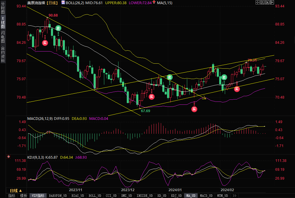 投资者将关注晚间23:30官方发布的EIA原油库存系列数据。维多公司(Vitol)首席执行官Russel Hardy周二表示,预计今年全球原油价格将基本稳定在每桶80美元左右。