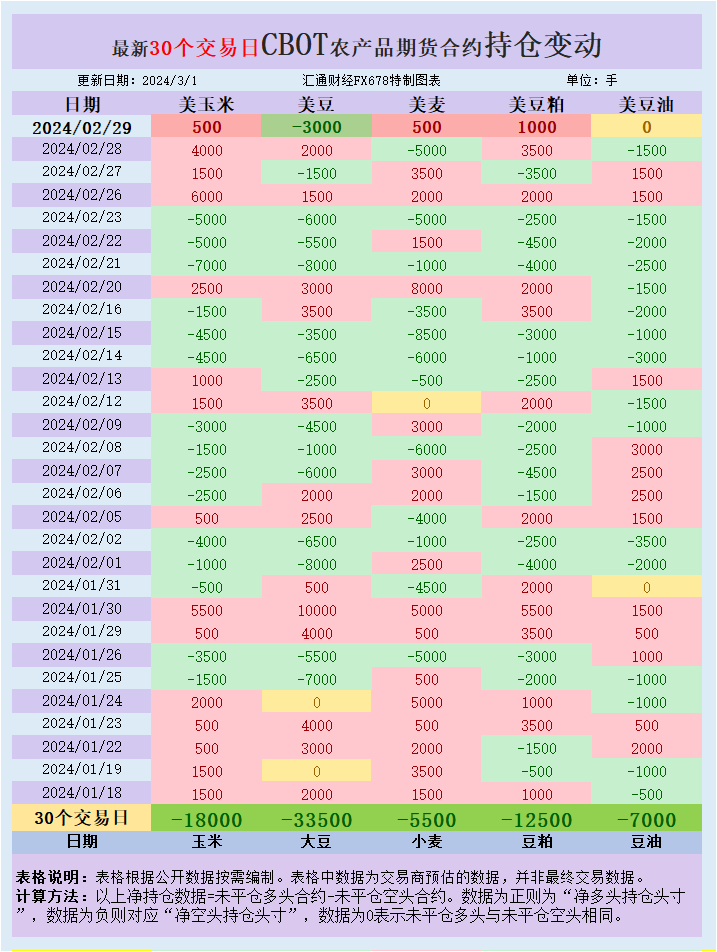 根据汇通财经观察,海外交易商估算的结果显示,本周四(2月29日),大宗商品基金增加CBOT美玉米、美小麦、美豆粕投机性净多头头寸,增加美豆投机性净空头头寸,美豆油未平仓多头与未平仓空头相同。2月全月,大宗商品基金增加CBOT美豆粕、美豆、美玉米、美麦、美豆油投机性净空头头寸。最新30个交易日,大宗商品基金增加CBOT美豆粕、美豆、美玉米、美麦、美豆油投机性净空头头寸。