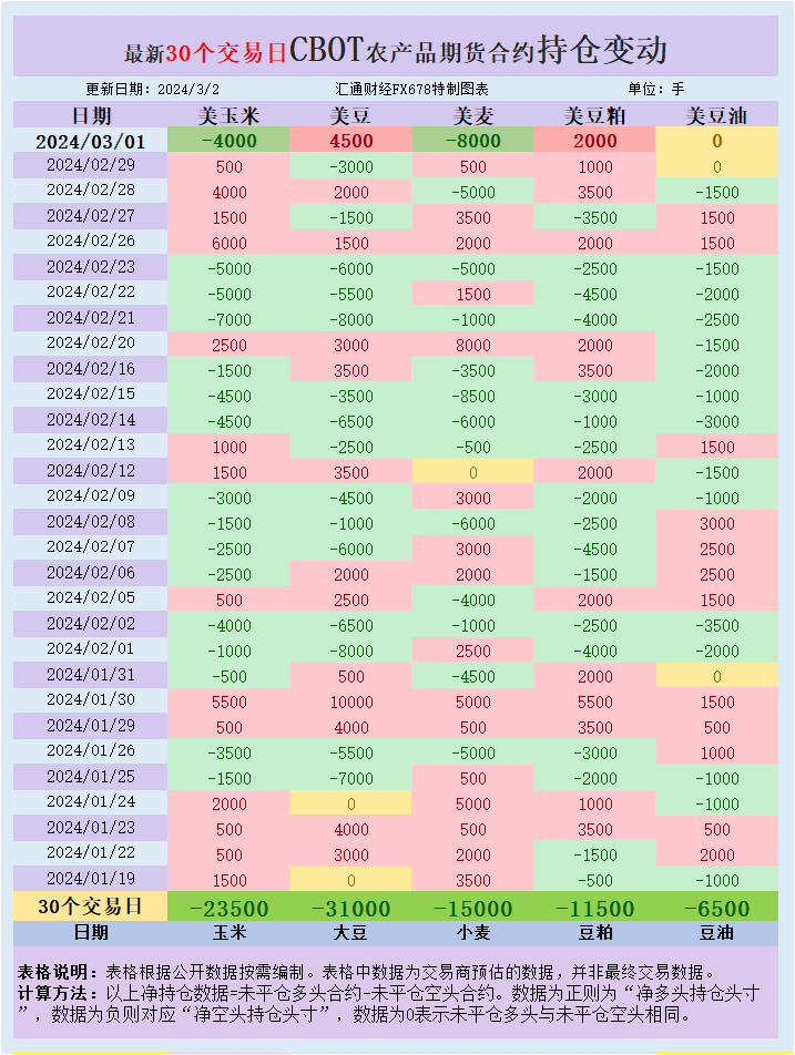 本周五(3月1日),大宗商品基金增加CBOT美豆、美豆粕投机性净多头头寸,增加美玉米、美小麦投机性净空头头寸,美豆油未平仓多头与未平仓空头相同。最新30个交易日,大宗商品基金增加CBOT美豆粕、美豆、美玉米、美麦、美豆油投机性净空头头寸。