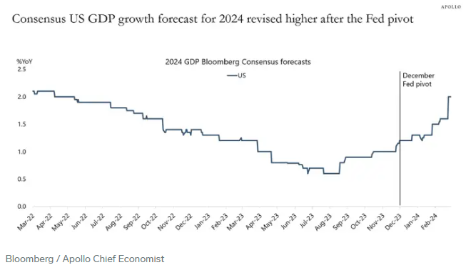 阿波罗(Apollo)首席经济学家托尔斯滕·斯洛克(Torsten Slok)表示:“现实情况是,美国经济根本没有放缓,美联储的政策转向自去年12月以来为经济增长提供了强劲的推动力。”“因此,美联储今年不会降息,利率将在更长时间内保持在较高水平。”#2024宏观展望#