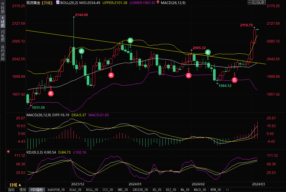 现货黄金窄幅震荡,目前交投于2115.45美元/盎司附近;金价周一触及三个月最高2119.79美元/盎司,12月4日触及的历史高点在2135.40美元,受对美联储6月降息的押注增加推动。
