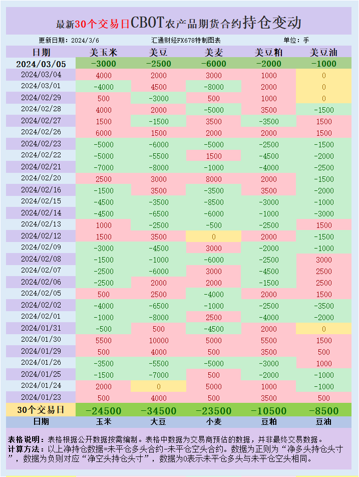 根据汇通财经观察,海外交易商估算的结果显示,本周二(3月5日),大宗商品基金增加CBOT美豆、美豆粕、美豆油、美玉米、美小麦投机性净空头头寸。最新30个交易日,大宗商品基金增加CBOT美豆粕、美豆、美玉米、美麦、美豆油投机性净空头头寸。