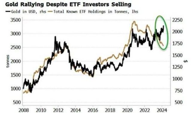 “近年来,摇摆买家是ETF,持有约2500吨黄金,”White说,“但是,尽管黄金价格上涨,ETF的持有量却在下降。”