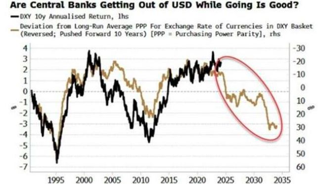 White分享了一张图表,表明未来几年美元可能会显著走弱。