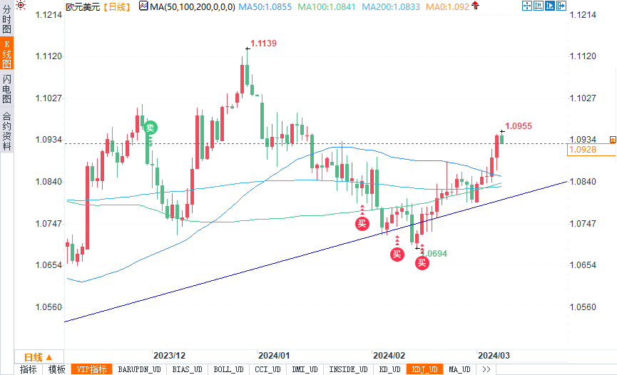 欧元兑美元周四反弹,在此过程中清除了主要阻力位置,并触及1月中旬以来的最高水平。在这一轮上涨之后,该货币对已经到达了重要阻力位1.0950的关口。价格在这里的反应将是关键,上破这一阻力可能会推动该货币对向1.1020移动。