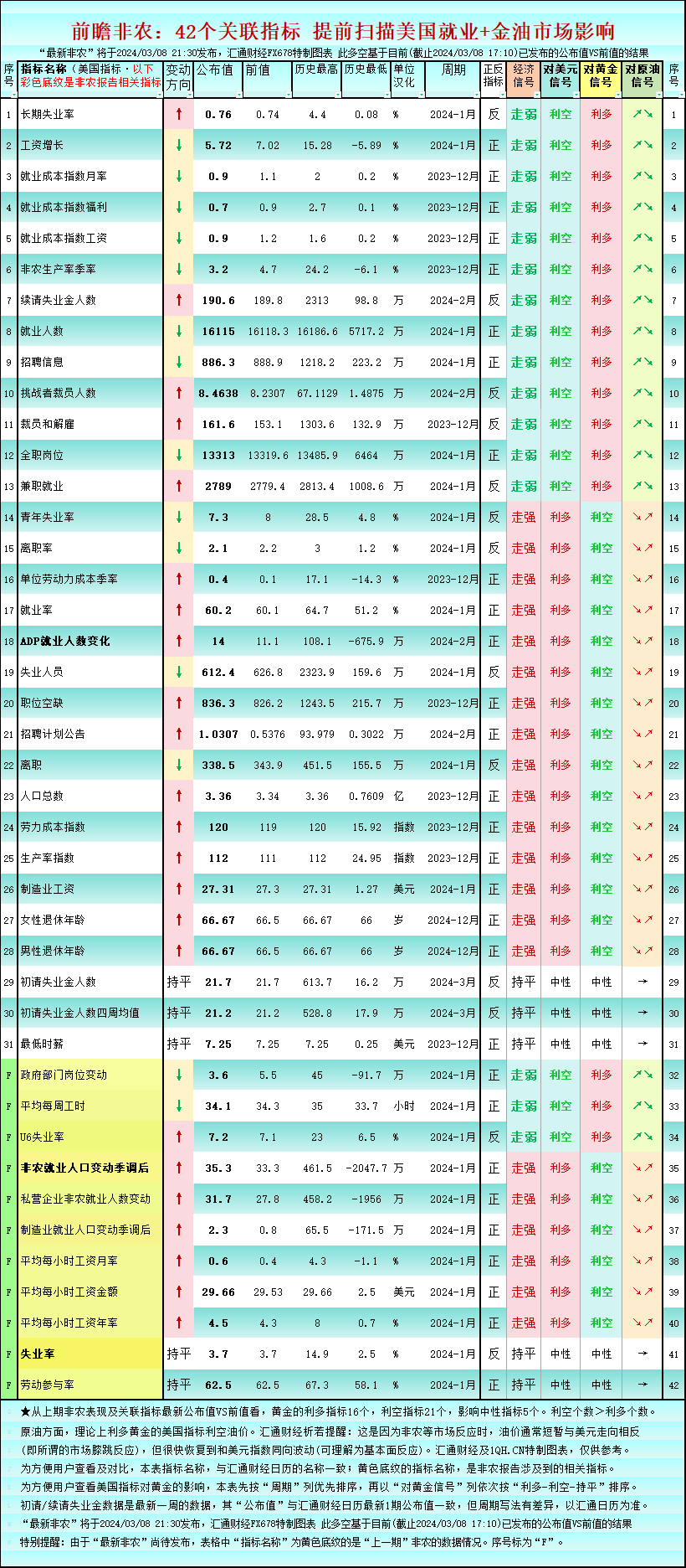 “最新非农”将于2024/03/08 21:30发布,汇通财经FX678特制图表 此多空基于目前(截止2024/03/08 15:40)已发布的公布值VS前值的结果。特别提醒:由于“最新非农”尚待发布,表格中“指标名称”为黄色底纹的是“上一期”非农的数据情况。序号标为“F”。