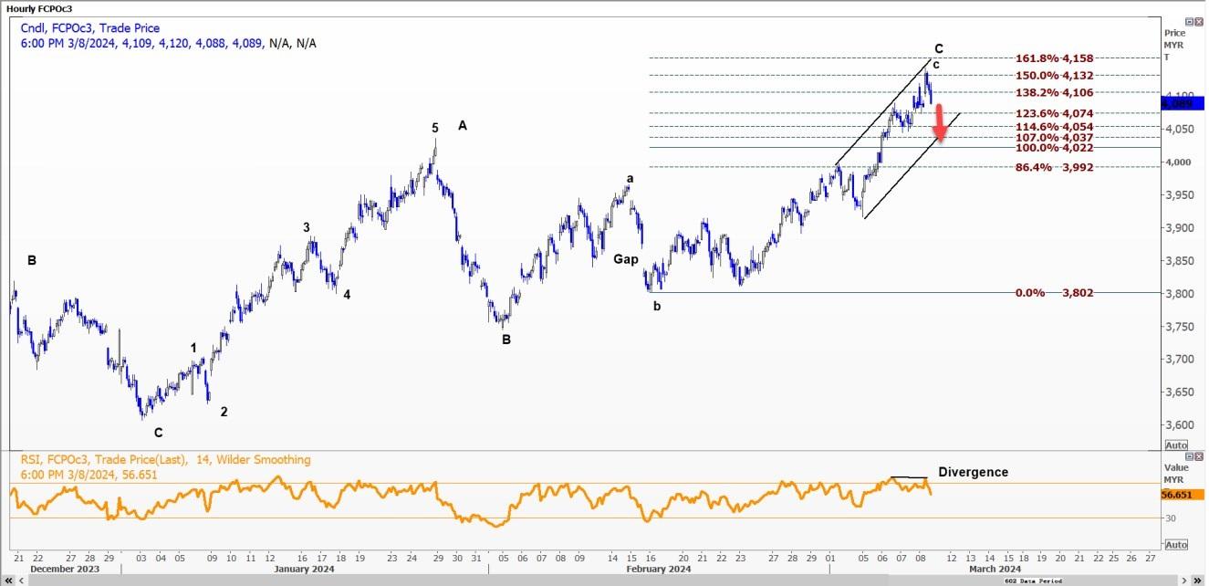 技术面看,马棕油FCPOc3在未能突破4158林吉特的阻力位后,可能会回撤至每吨4037-4054林吉特的支撑区域。此次失败还伴随着每小时RSI的看跌背离,这表明反弹已经耗尽。应该进行适当的修正。