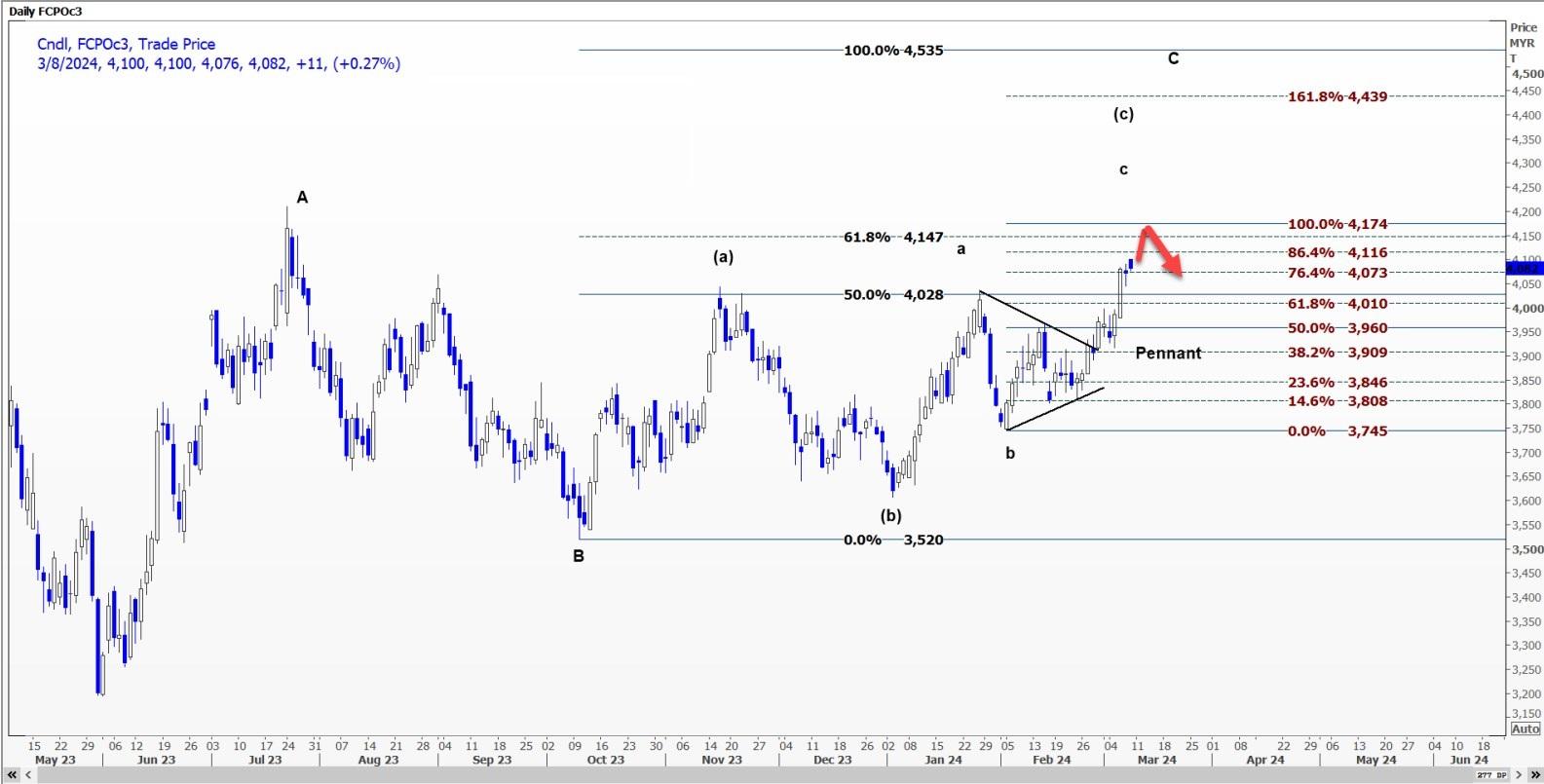 日线图上,对来自3520林吉特的C浪进行预测分析,发现强劲阻力位在4147林吉特。另一项对来自3745林吉特的小波c的预测分析表明,类似的阻力位于4174林吉特。