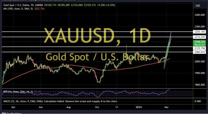 现货黄金冲高回落,一度高见2188.88美元/盎司,逼近上周创下的历史新高2195.07美元,目前回落至2180美元附近,FXDailyReport分析师Nicholas Kitonyi撰指出,多头目标看向2220-2255附近区域。