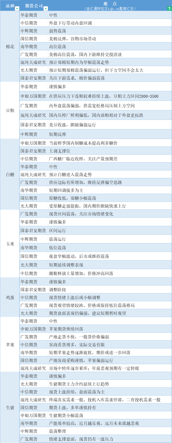 标题:期货公司观点汇总一张图:3月13日农产品(棉花、豆粕、白糖、玉米、鸡蛋、生猪等)