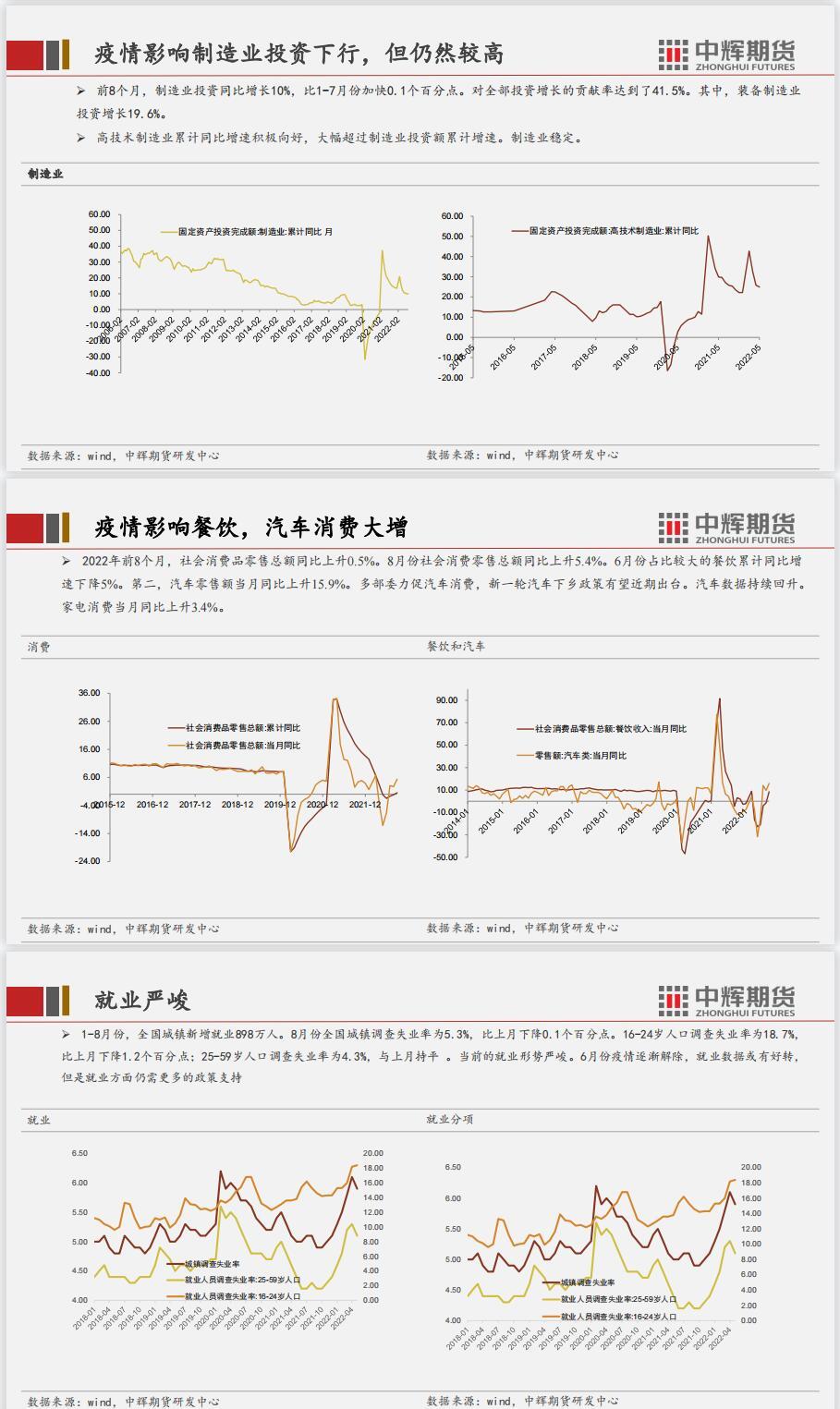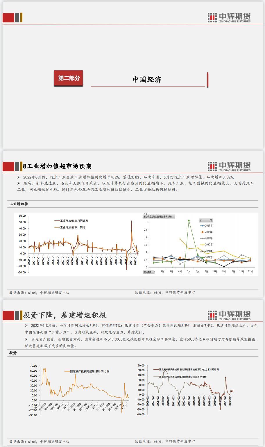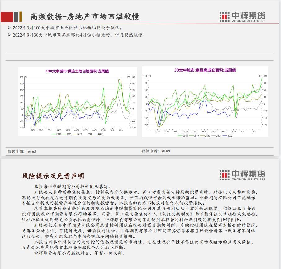 结论:短期国内经济数据边际利好,但是地产数据较差,政策维稳为主。二十大召开之前相关的环保政策、安检措施将会严格,对相关产业有影响。美联储议息会议决议加息75个基点符合预期,但是点阵图显示对未来激进加息的预期并没有转向宽松,多国跟随激进加息,11月会议之前,加息预期继续困扰市场。