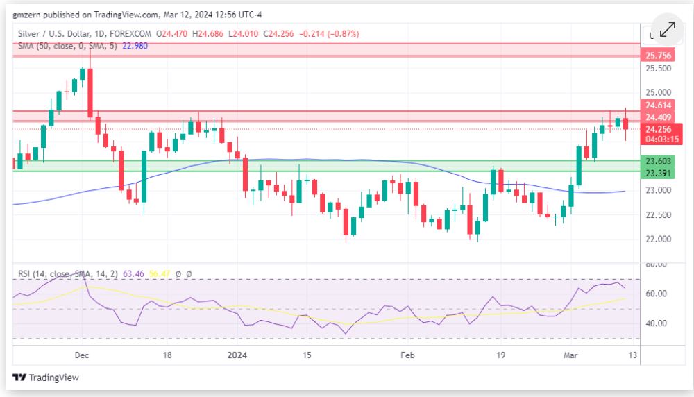如果白银跌破24.00美元/盎司水平,将向下走向最近的支撑位23.40美元/盎司至23.60美元/盎司。