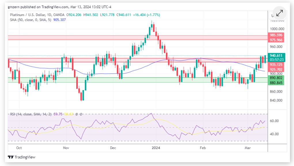 如果铂金保持在935美元以上,它将朝着下一个阻力水平975 - 985美元前进。