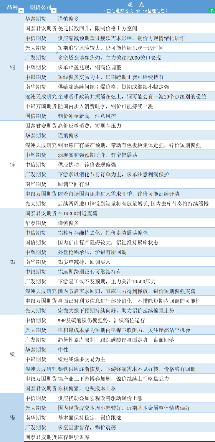 期货公司观点汇总一张图:3月15日有色系(铜、锌、铝、镍、锡等)