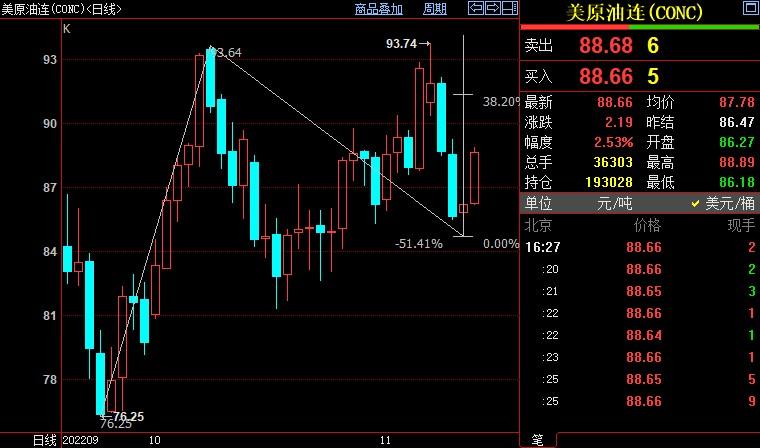 北京时间16:33,NYMEX原油期货上涨2.68%至88.79美元/桶;ICE