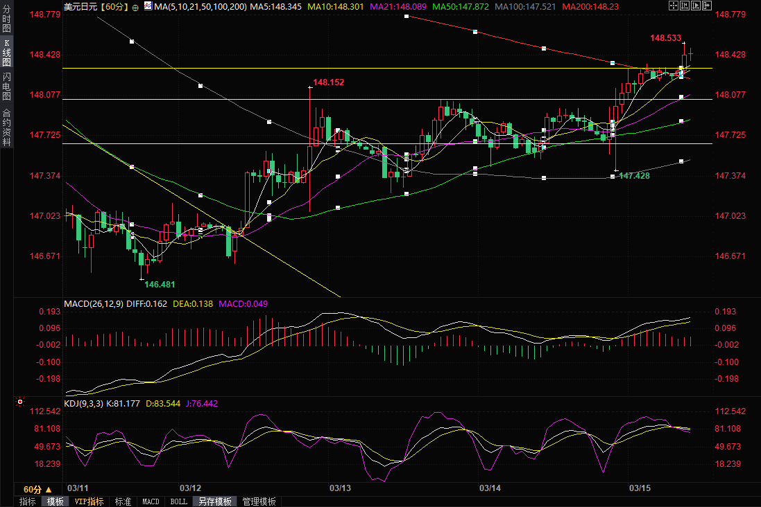 美元/日元周四从147.44升至148.36 ,周五亚洲盘延续涨势,最高触及148.53,为逾一周新高,目前交投于148.48附近,涨幅约0.1%。交易员指出,汇价来到200小时均线148.23上方,50小时均线位于147.87,小时图云区与100小时均线昨天共同起到支撑作用。云区目前位于147.41-67,100小时均线147.49位于云区内。