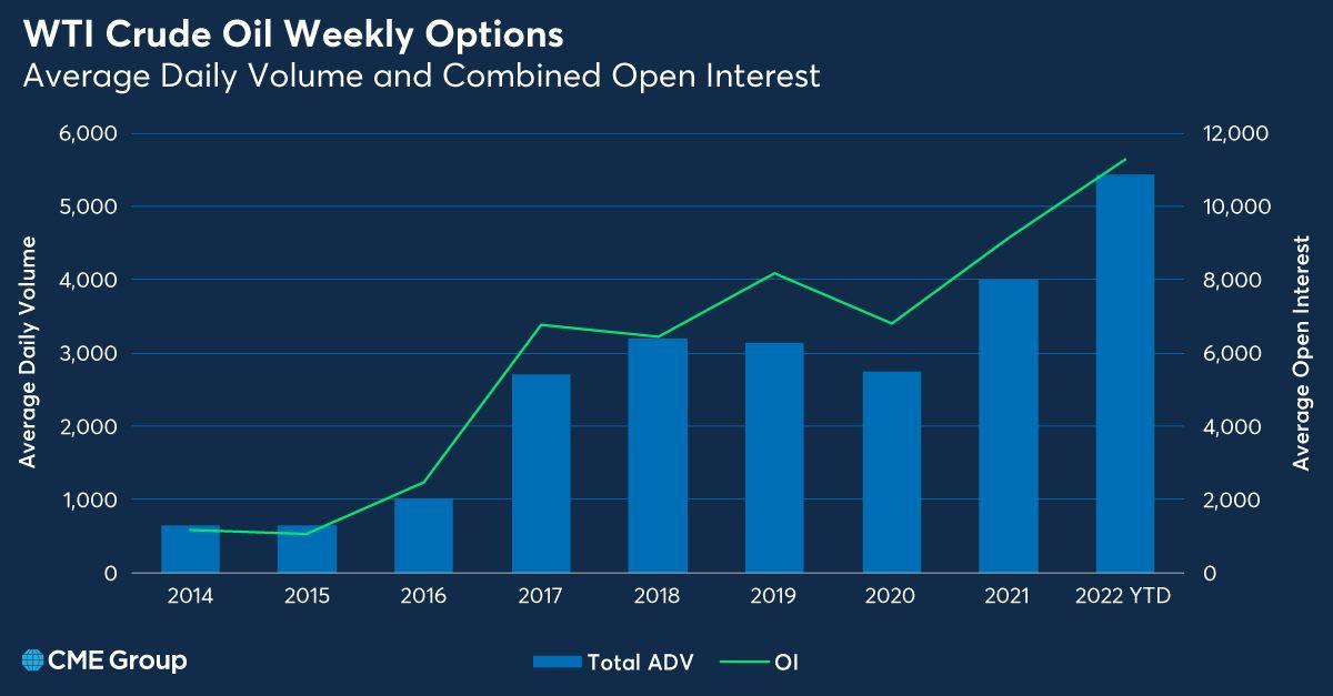 2022年6月,芝商所推出了微型WTI原油期权,提供每月(MCO)和每周五(MW1-MW5)到期合约,使不同交易者都可以参与世界上流动性最高的原油期权市场。微型WTI原油期权交易量同比增长34%,达到创纪录的每日5500份合约。平均未平仓合约也达到了创纪录的11,300份合同(看下图),占非美国时间段总交易量的21%,创历史最高水平。