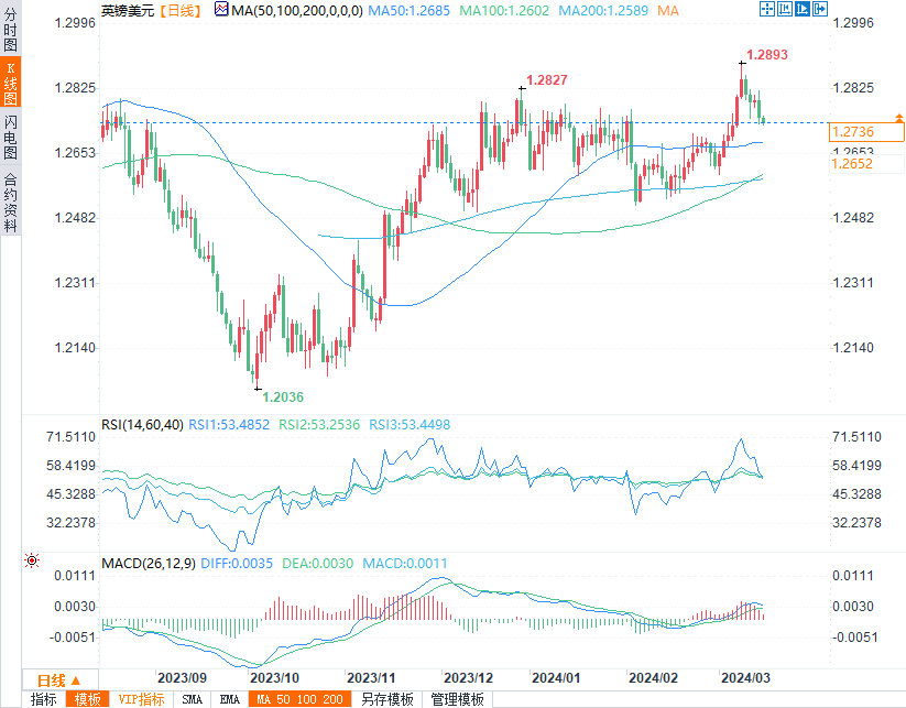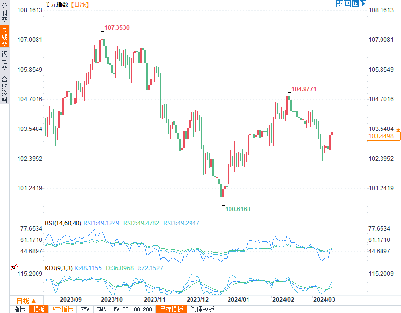 美元指数报103.47,涨幅0.12%。美元/日元报148.672,涨幅0.26%。欧元/美元报1.0878,跌幅0.06%。英镑/美元报1.2735,跌幅0.13%。