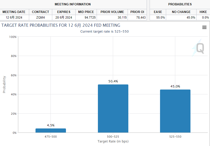 交易员对6月降息的押注有所减少,CME FedWatch工具目前认为6月降息的可能性为55%,上周则高于70%。
