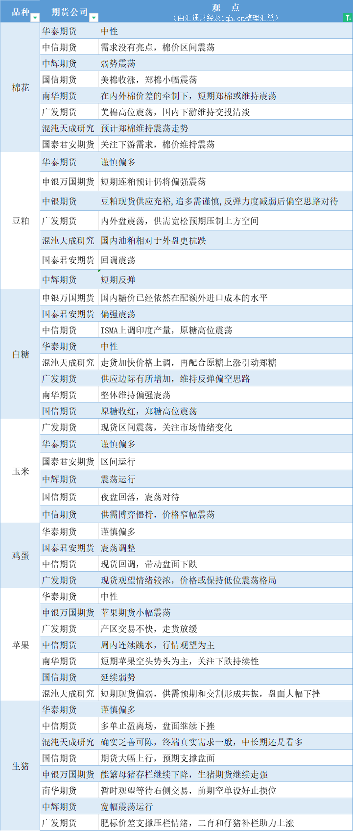 期货公司观点汇总一张图:3月19日农产品(棉花、豆粕、白糖、玉米、鸡蛋、生猪等)