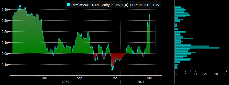 随着市场普遍预计日本央行将在两日会议后取消负利率政策,韩元和日元的货币走势更加一致。本月韩元对日元的60日相关指数达到0.35,创下自2023年5月以来的最高水平,显示两国货币同步移动。