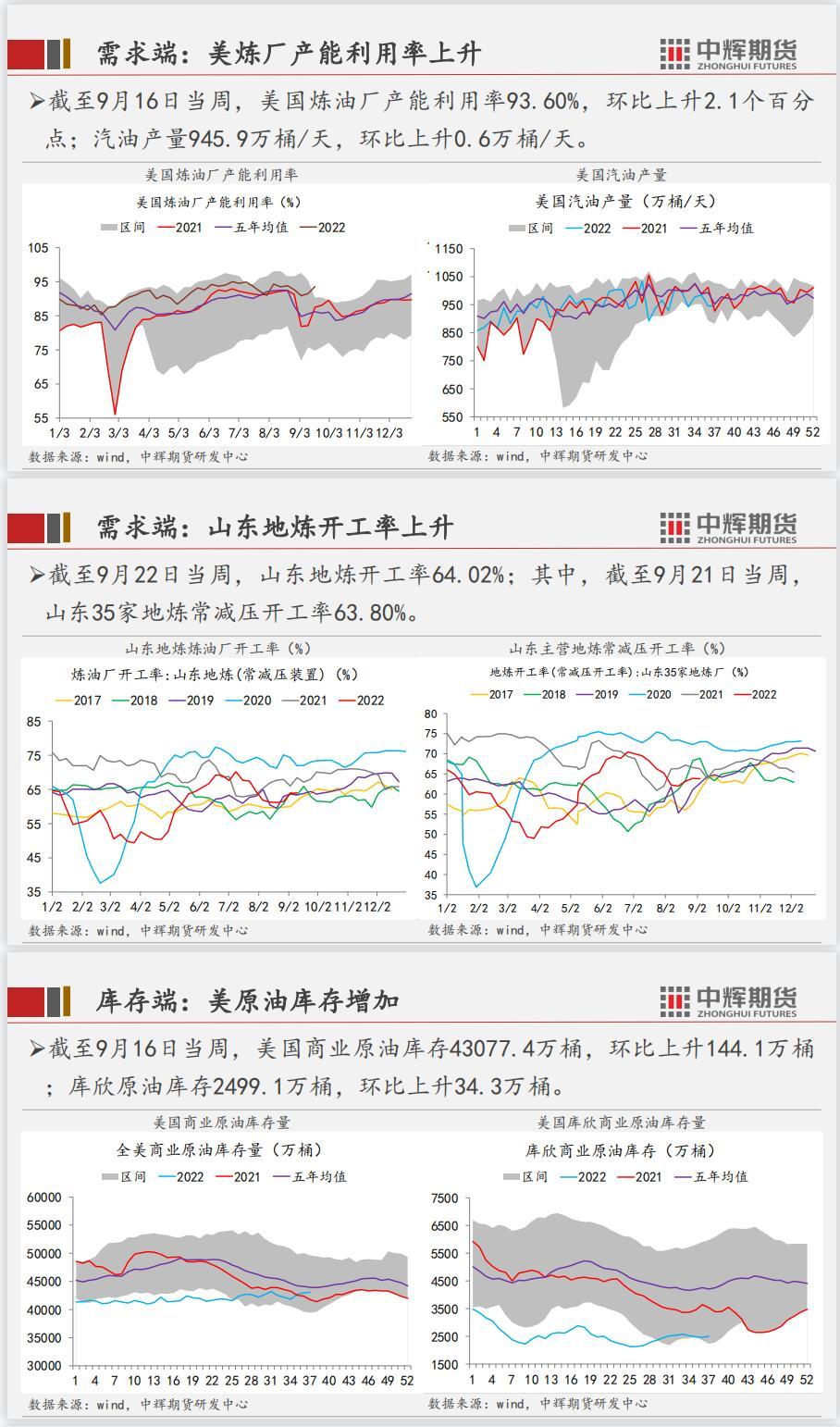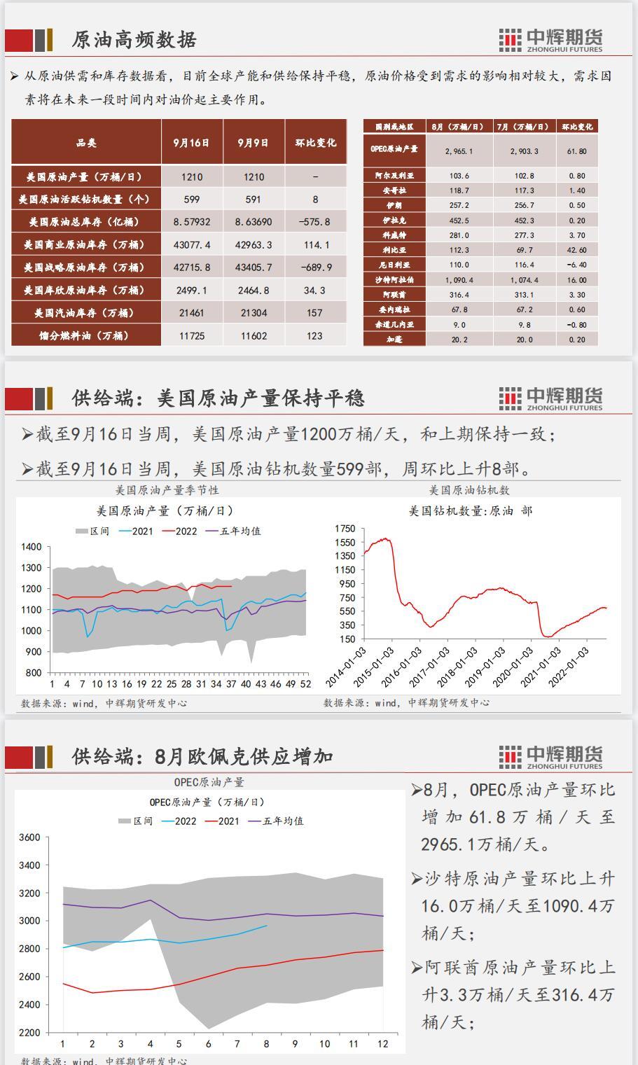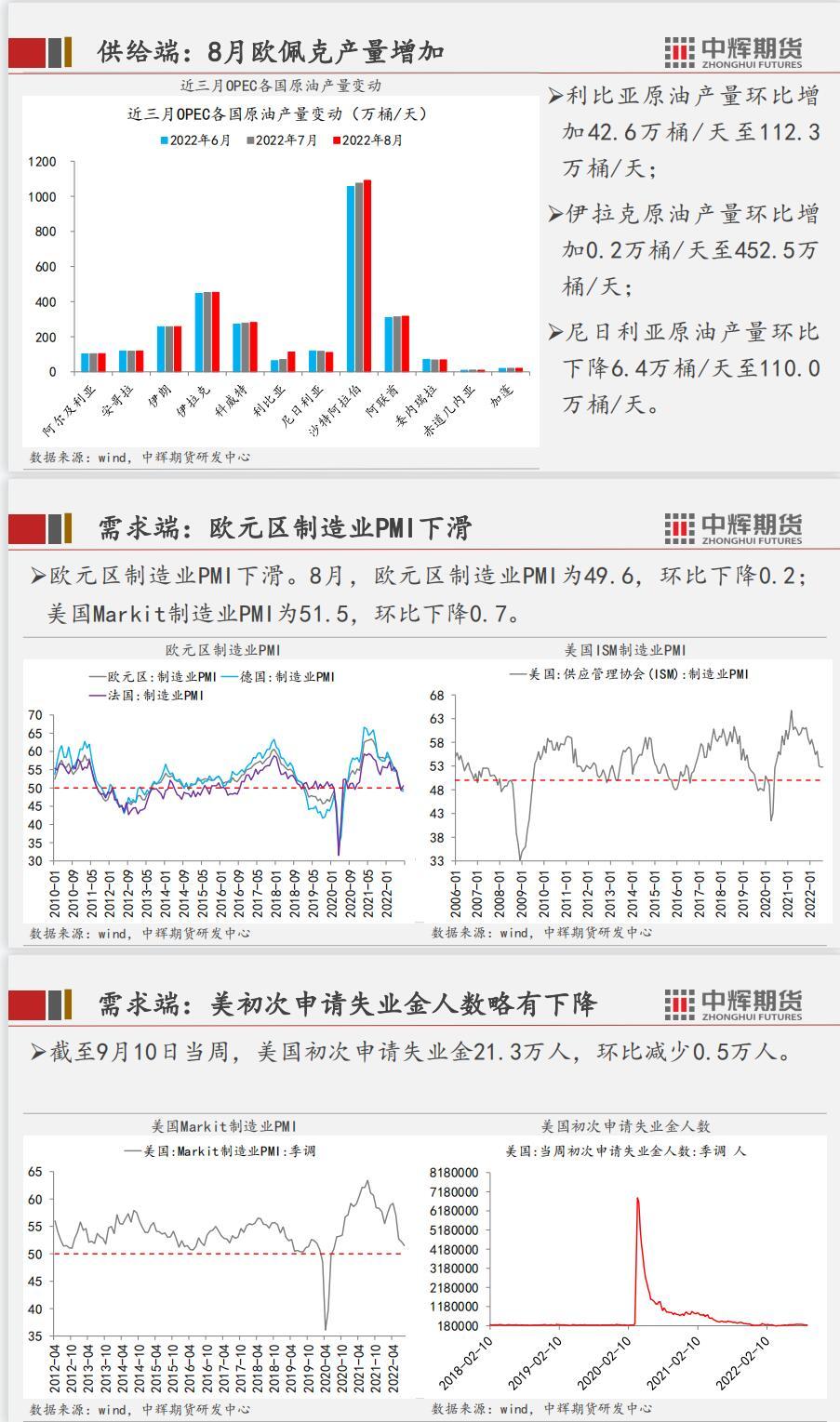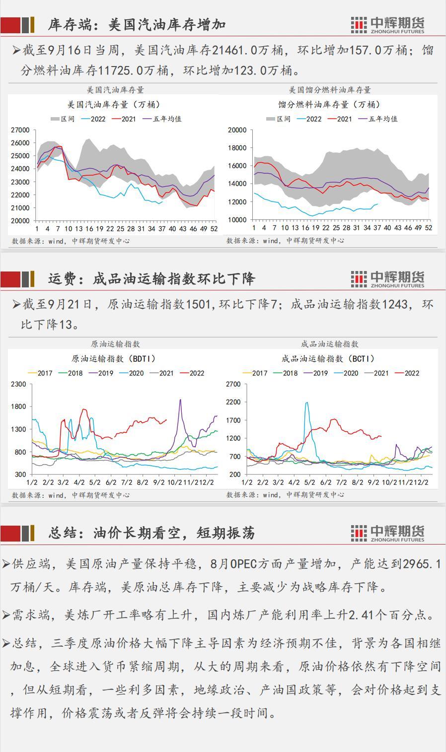 供应端,美国原油产量保持平稳,8月OPEC方面产量增加,产能达到2965.1 万桶/天。库存端,美原油总库存下降,主要减少为战略库存下降。需求端,美炼厂开工率略有上升,国内炼厂产能利用率上升2.41个百分点。总结,三季度原油价格大幅下降主导因素为经济预期不佳,背景为各国相继加息,全球进入货币紧缩周期,从大的周期来看,原油价格依然有下降空间,但从短期看,一些利多因素,地缘政治、产油国政策等,会对价格起到支撑作用,价格震荡或者反弹将会持续一段时间。