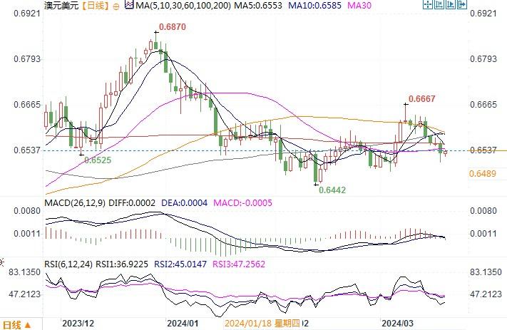 周二(3月19日),澳元/美元继续下跌0.85%,至近两周低点0.6504。周二澳洲央行一如预期维持利率不变,但对政策前景持更加谨慎的态度。澳洲央行维持利率在4.35%的12年高位,这并不意外,但略显鸽派,因为其中删除了不排除进一步加息的警告。相反,央行政策委员会表示,未来政策“不排除任何可能性”。利率期货走势表明,6月首次降息的几率约为43%,8月的几率升至74%。目前市场定价认为,在2024年放宽政策的可能性为44个基点,而在决议宣布之前为38个基点。澳联储3月会议上偏鸽的态度,恐将继续影响到澳元的表现。日线图上,澳元/美元跌落至布林带通道中轨线之下,且隔夜尝试跌穿过强支撑位0.6520,而且技术指标MACD形成死叉,RSI下行低落于均衡线之下,显示澳元空头力量有所增强。下方若进一步跌穿0.6500整数关口,进一步将考验0.6470附近的支撑。目前上方0.6630附近构成了较重的头部。