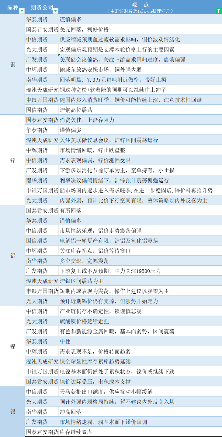 标题:期货公司观点汇总一张图:3月21日有色系(铜、锌、铝、镍、锡等)