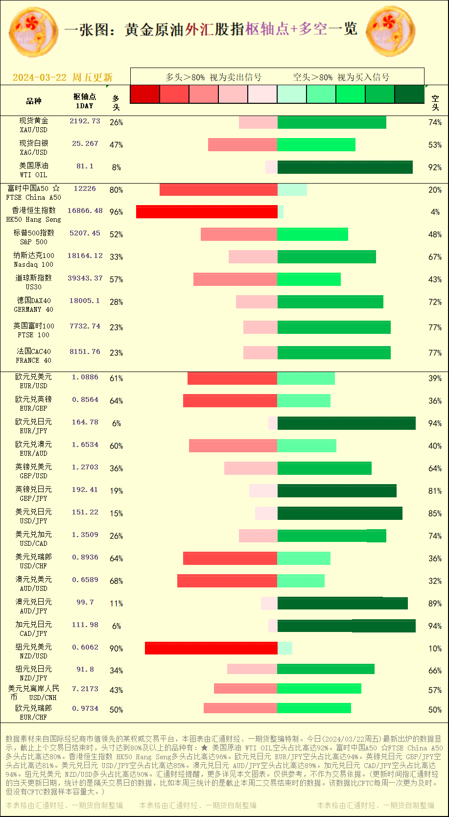 标题:一张图:2024/03/22黄金原油外汇股指"枢纽点+多空占比"一览