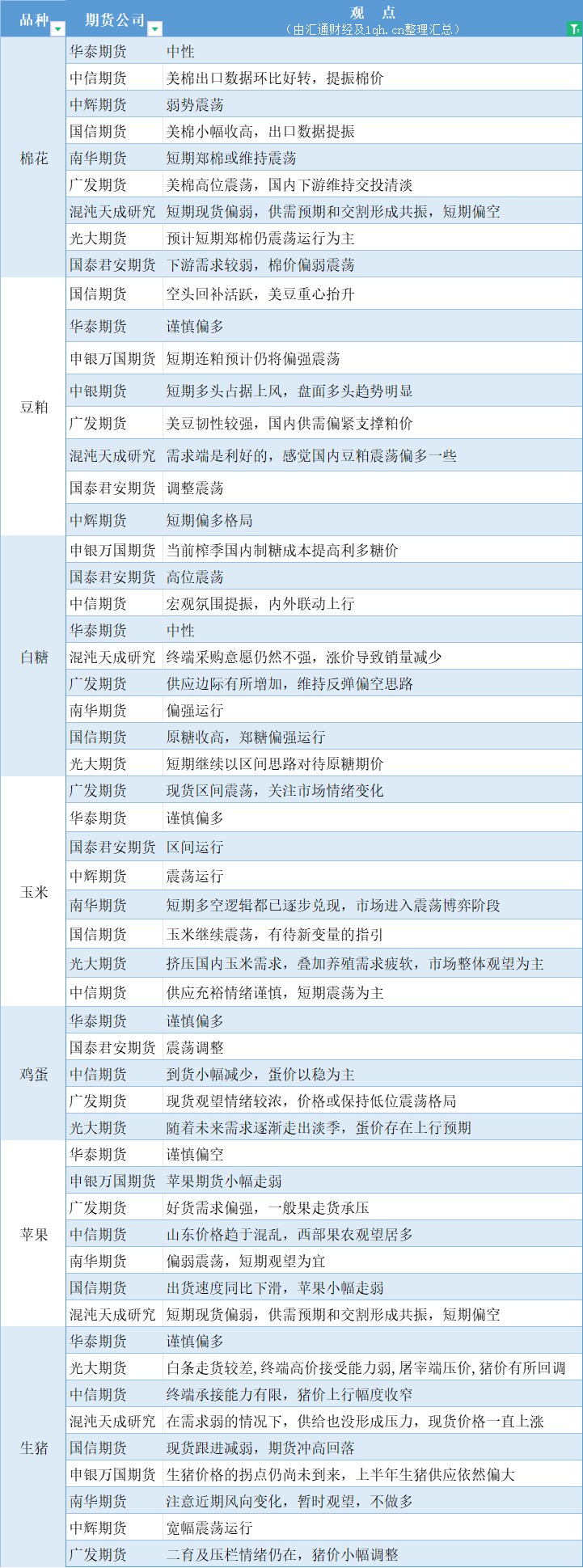 期货公司观点汇总一张图:3月22日农产品(棉花、豆粕、白糖、玉米、鸡蛋、生猪等)