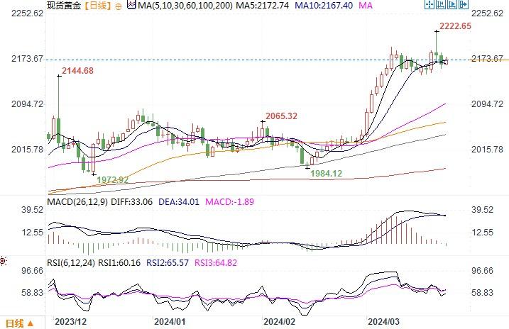 金价上周在达到2220美元/盎司上方的历史新高后出现深度回调。美联储在上周三维持利率不变且继续发出降息信号,但宽松周期的深度仍将取决于数据。美联储已暗示2024年美国仍可能降息三次,但这一切都取决于经济数据,这些数据可能支持或反对降息论点。而事实上,美国经济数据依然强劲。上周四晚些时候,美国公布的乐观宏观经济数据帮助美元果断反弹,并迫使黄金回落至2200美元/盎司以下。周四美国劳工部报告称,截至3月16日当周,初请失业金人数下降至21万人。此外,标普全球(S&P Global)公布的美国3月份综合PMI初值为52.2,表明私营部门的商业活动继续以健康的速度扩张。标普全球市场情报(S&P Global Market Intelligence)首席商业经济学家Chris Williamson表示,在评估PMI调查结果时,“成本的急剧上升,加上近期需求回升带来的定价权增强,意味着通胀压力在3月份再次加速。”这对于美联储6月份具不具备降息条件,不禁要打上个问号。本周,美国一系列重要数据将要登场:周二将公布2月份耐用品订单数据和谘商会(Conference Board)3月份消费者信心指数;周四,美国经济分析局(BEA)将公布第四季度国内生产总值(GDP)的终值,并将于周五公布2月份个人消费支出(PCE)物价指数数据。如果本周上述重要经济数据仍然表现强劲,黄金进一步上涨的动力恐会遭到削弱,从而将维持调整回落的交易节奏。相反,若数据不佳,则有望刺激黄金再度尝试闯试高峰。