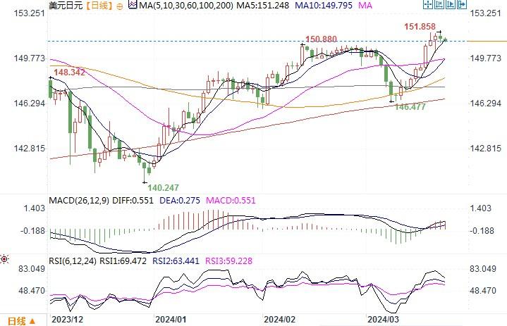 美元兑日元则在稍触碰了上年日本央行干预水平后略下跌了0.12%,报151.44。上周,美联储将隔夜利率维持在5.25%-5.5%之间,并坚持年底前三次降息的预测。但美联储同时表示,在确信通胀率可持续下降至2%的目标之前,不会降息。而瑞士意外降息凸显了美联储与其他央行在利率政策方面的差异。由于美国经济相对强劲和高利率使利差交易保持活跃。虽然上周日本央行开始结束了负利率时代,但是对于进一步加息则显露谨慎的态度。因此日元也并未从中获得抬捧而走升,而与美元现实中存在的巨大利差,依旧令日元负重,在套利交易模式下,日元仍难免不成为被抛售的对象。技术图形上,短线小时图上,美元/日元或因忌惮日本央行的干预,进入小幅调整之中。而日线级别图上,目前汇价仍保持在布林带通道中轨线远上方,各项技术指标也仍处在均衡线略上方,显示美元多头暂时仍占优。如果短线调整不能将汇价压迫于150之下,则美元/日元仍有望维持上走的趋向。只有收盘跌落150之下,或才有望扭转跌势。
