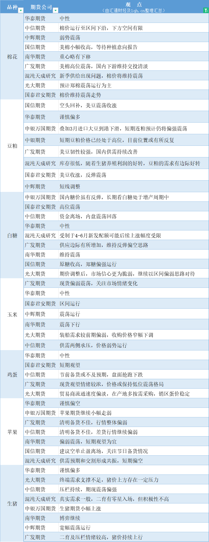 期货公司观点汇总一张图:3月26日农产品(棉花、豆粕、白糖、玉米、鸡蛋、生猪等)