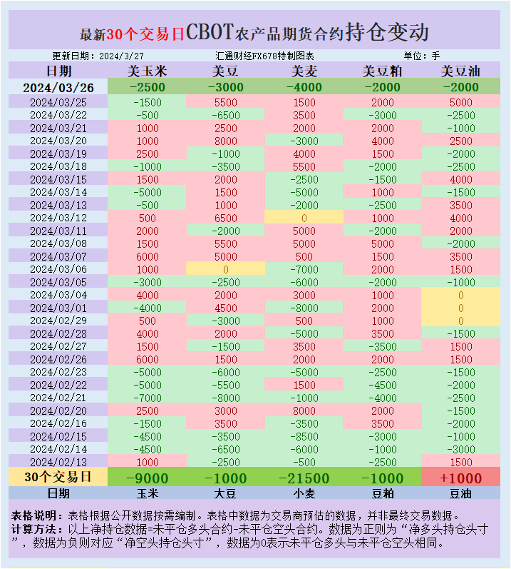 根据汇通财经观察,海外交易商估算的结果显示,本周二(3月26日),大宗商品基金增加CBOT美豆、美豆粕、美豆油、美小麦、美玉米投机性净空头头寸。最新30个交易日,大宗商品基金增加CBOT美豆粕、美豆、美玉米、美小麦投机性净空头头寸,增加美豆油投机性净多头头寸。