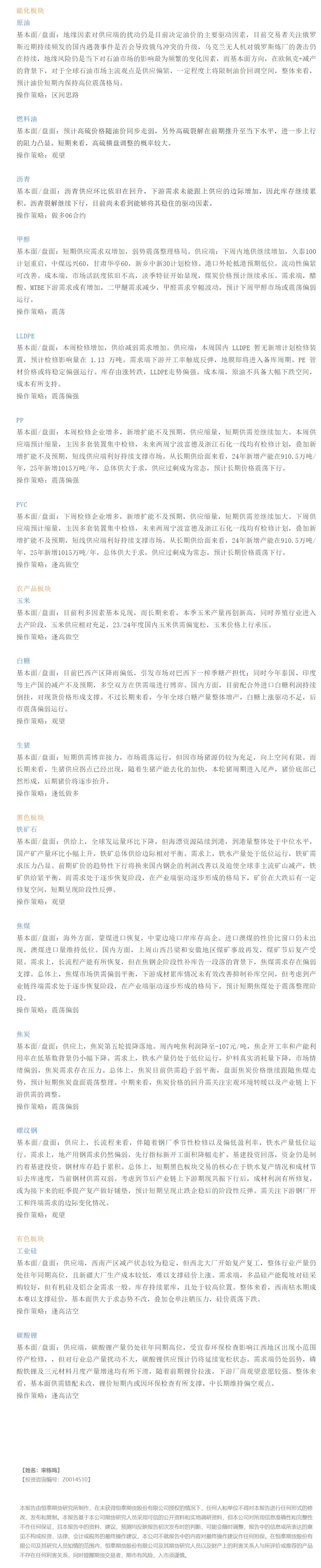 以下是恒泰期货今日早间交易策略,覆盖品种有:宏观分析、原油燃料油等能源化工、豆粕豆油大豆玉米白糖生猪等农产品、黑色系如铁矿石焦煤焦炭螺纹钢、有色系如工业硅碳酸锂等。