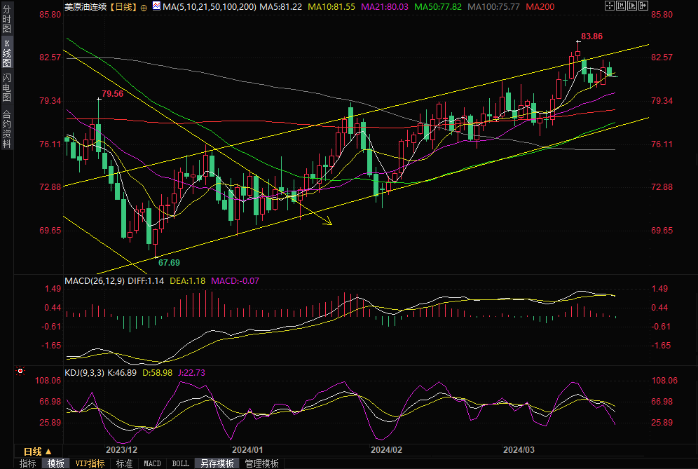 布伦特原油期货收跌0.50美元,报每桶86.25美元;美国原油期货收跌0.86%,报81.26美元。交投更活跃的布伦特6月原油期货下跌0.9%,报85.27美元。