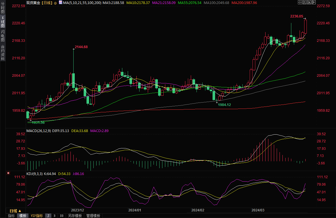现货黄金周四上涨1.74%,至每盎司2232.78美元,盘中创下2236.05美元的纪录新高。金价3月上涨9%,创2020年7月以来最佳月度表现,且连续第二个季度上涨。美国期金收高1.2%,报每盎司2238.4美元。