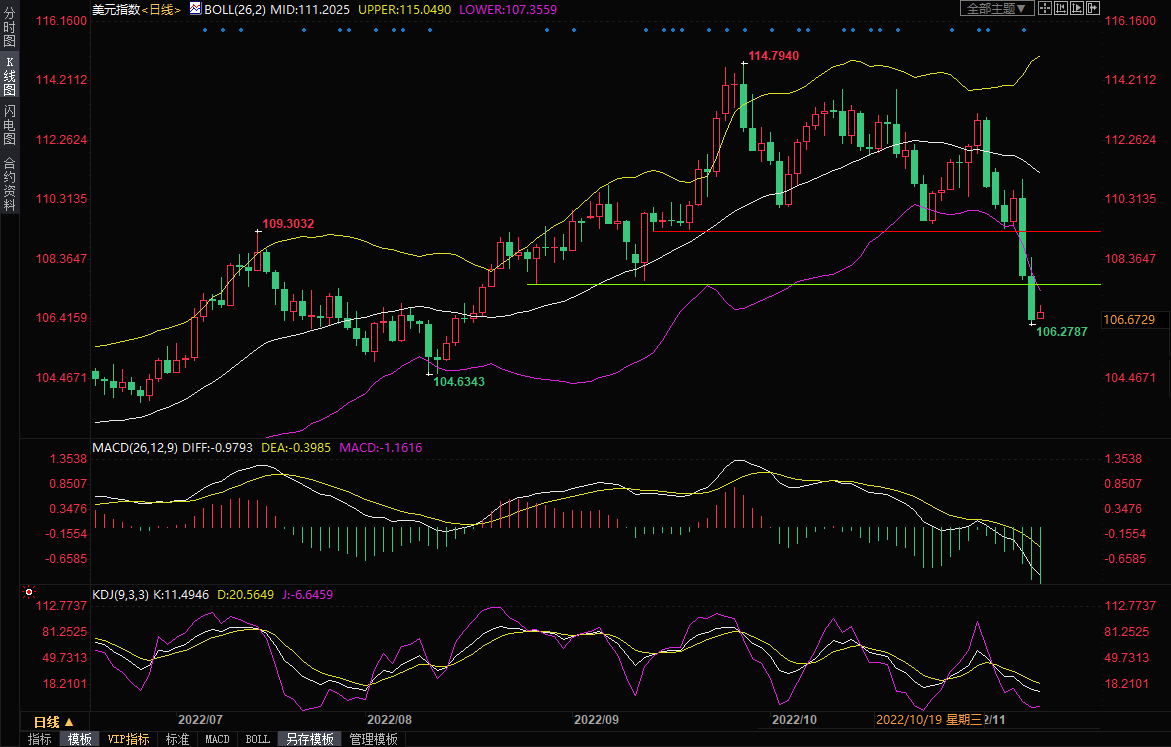 【美元连跌两天,创下2009年3月以来最大两日百分比跌幅】美元上周五(11月11日)下跌1.33%,连续第二天全面下跌,盘中最低触及106.27,为8月16日以来新低,过去两个交易日累计下跌3.6%,为2009年3月以来最大两日百分比跌幅,近因投资者青睐风险较大的货币,此前有迹象表明美国的通胀正在降温,这增强了美联储可以放缓大幅加息的理据。
