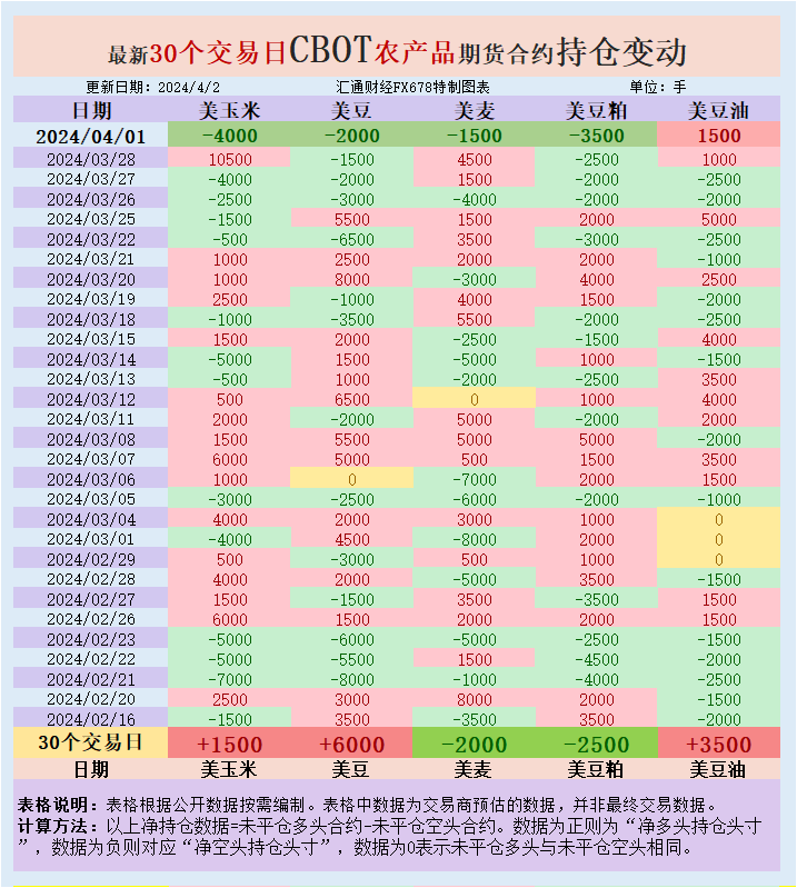 本周一(4月1日),大宗商品基金增加CBOT美小麦、美豆、美豆粕、美玉米投机性净空头头寸,增加美豆油投机性净多头头寸。最新30个交易日,大宗商品基金增加CBOT美豆粕、美小麦投机性净空头头寸,增加美豆、美玉米、美豆油投机性净多头头寸。