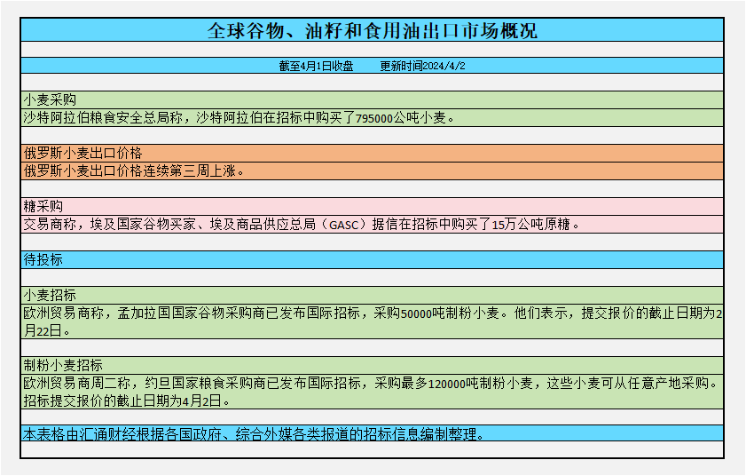 截至周一收盘,全球谷物、油籽和食用油出口市场招标、采购概况:
