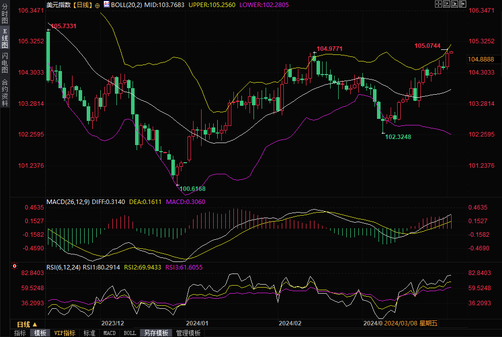 美元上涨了0.5%,达到四个多月来最高,周一最高触及105.07,为11月15日以来新高,使得黄金对其他货币持有者来说更加昂贵,而10年期美债收益率也攀升。美国经济数据相对明显强于其他发达经济体国家,而且在美国3月ISM制造业PMI数据出炉后,市场对美联储6月份降息预期再度回落。