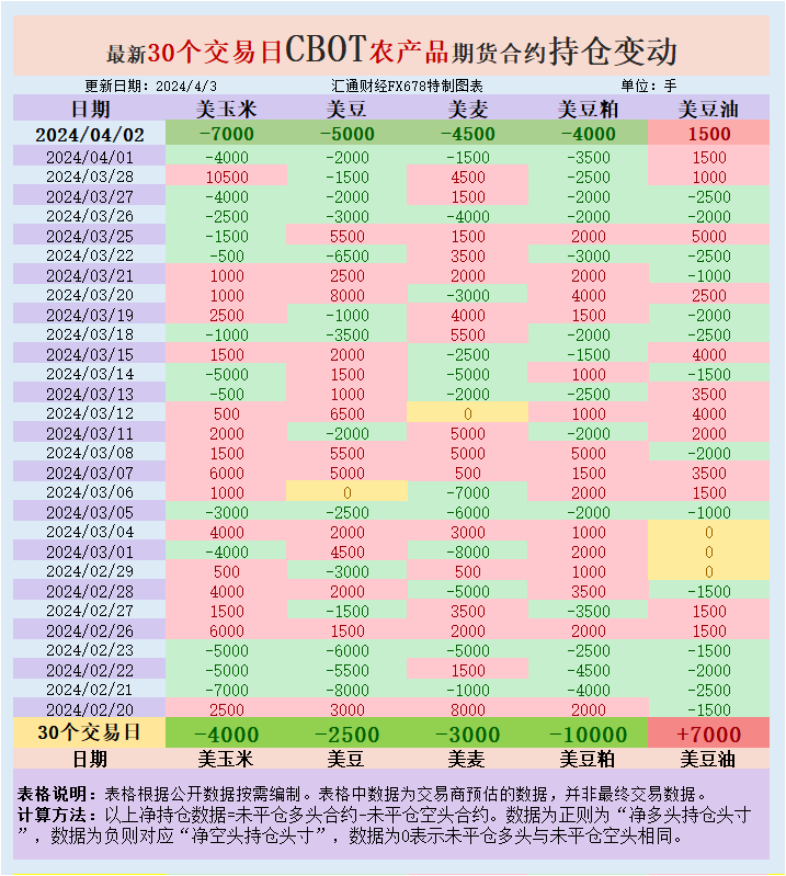 本周二(4月2日),大宗商品基金增加CBOT美小麦、美豆、美豆粕、美玉米投机性净空头头寸,增加美豆油投机性净多头头寸。最新30个交易日,大宗商品基金增加CBOT美豆、美玉米、美豆粕、美小麦投机性净空头头寸,增加美豆油投机性净多头头寸。