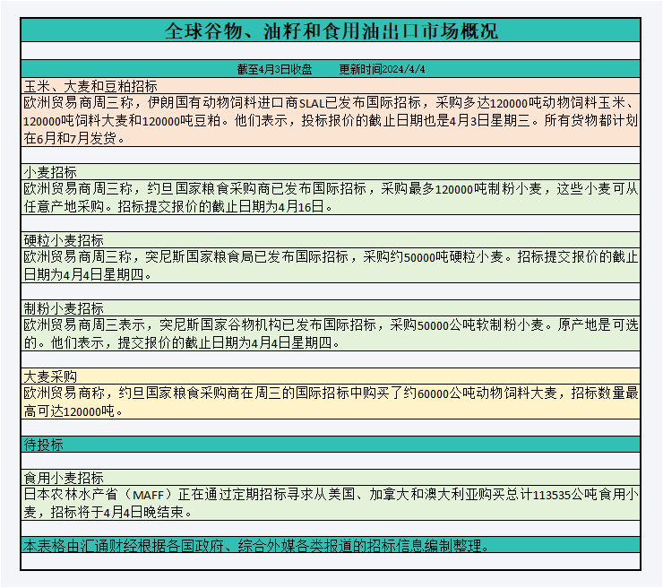 严重干旱迫使世界上最繁忙的贸易通道之一巴拿马运河限制每日通行,可能会在需求旺盛时期影响全球供应链。截至周三收盘,全球谷物、油籽和食用油出口市场招标、采购概况: