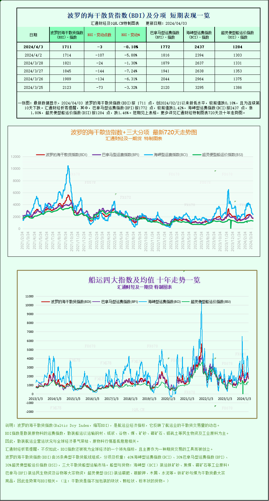 汇通财经APP讯——最新数据显示,2024/04/03 波罗的海干散货指数(BDI)报 1711 点,创2024/02/21以来新低水平,较前值跌0.18%,且为连续第10天下跌。其中,巴拿马型运费指数(BPI)报1772 点,较前值跌2.42%,海岬型运费指数(BCI)报2437 点,涨1.80%,超灵便型船运价指数(BSI)报1284 点,跌1.46%。波罗的海干散货指数+三大分项的最新720天走势图、十年走势图等详见汇通财经特制图表。