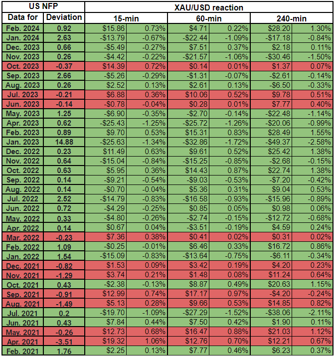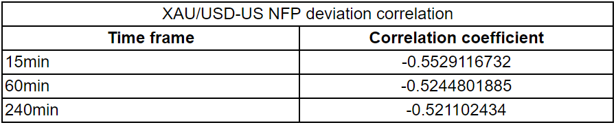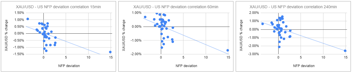 我们绘制了非农数据发布后的15分钟、1小时和4小时内的黄金价格反应。然后,我们将黄金价格的反应与实际非农结果与预期结果之间的偏差进行比较。