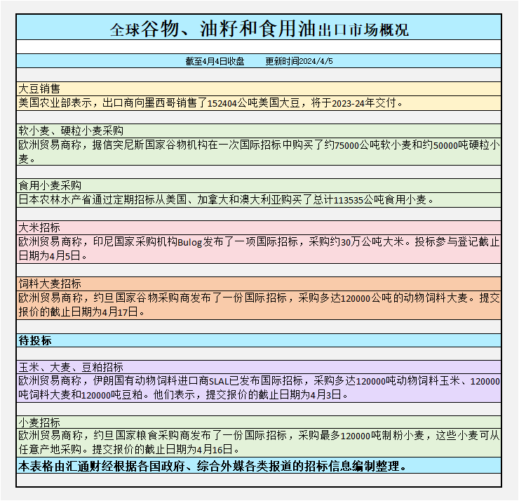 截至周四收盘,全球谷物、油籽和食用油出口市场招标、采购概况: